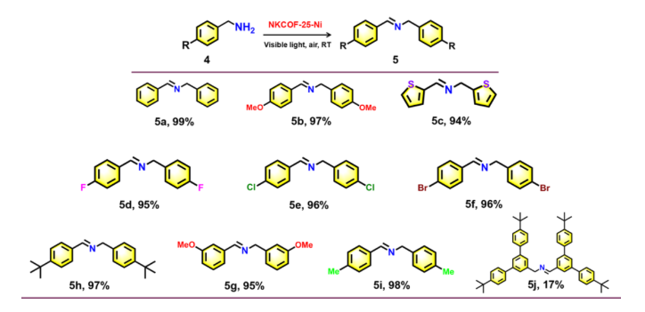 图6:NKCOF-25-Ni催化苄胺类物质的氧化偶联反应的底物拓展结果。