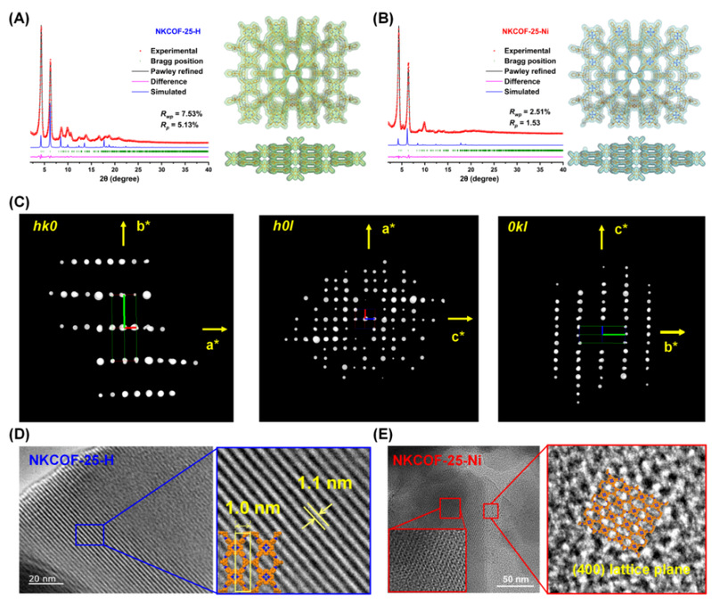 图2:(A, B) NKCOF-25-X的PXRD谱图以及结构图示;(C) NKCOF-25-H的三维电子衍射数据;(D, E) NKCOFs的HRTEM图像
