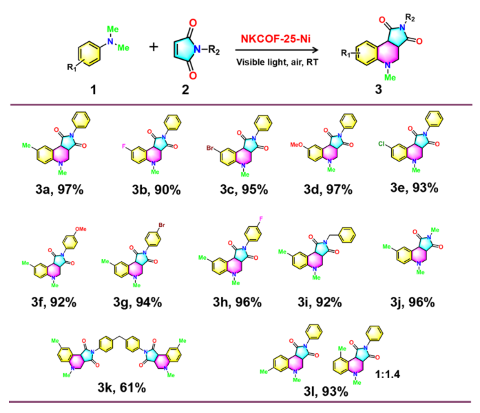 图5:NKCOF-25-Ni催化二甲基苯胺与马来酰亚胺类化合物反应的底物拓展结果。