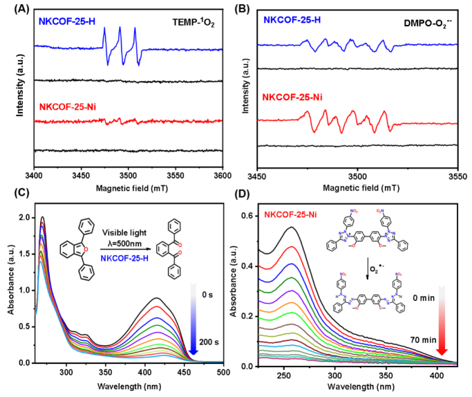 图4:(A, B) TEMP捕获1O2和DMPO捕获O2•−的EPR检测图;(C, D) NKCOFs存在下,DPBF和NBT的紫外-可见吸收光谱随时间变化情况图