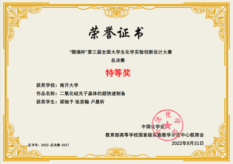 8月21日至24日,第三届全国老员工化学实验创新设计竞赛总决赛在厦门大学举行。由Betway必威邱晓航、朱宝林老师指导,Betway必威本科生梁驰予、张思翰、卢晨昕完成的新创实验项目“二氧化硅光子晶体的超快速制备”获得大赛特等奖。这是南开学子连续三年在该赛事中斩获特等奖。