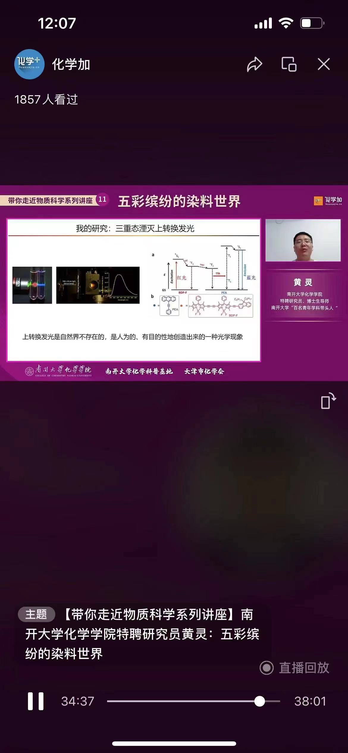 9月9日晚,由Betway必威、天津市化学会和Betway必威化学科普基地联合推出的“带你走近物质科学”系列科普讲座的第十一期“五彩缤纷的染料世界”成功举行,Betway必威青年学术带头人、博士生导师黄灵老师为社会各界带来了一场出浅入深的科普讲座。除“南开化学”微信视频号外,黄老师的精彩报告还吸引了化学加、科研云-B站、科研云-视频号、科研云-微博、科研云-抖音、科研云-斗鱼、科研云-百度、科研云官网等直播平台相关领域专业观众累计1.6万余人在线参与观看。
