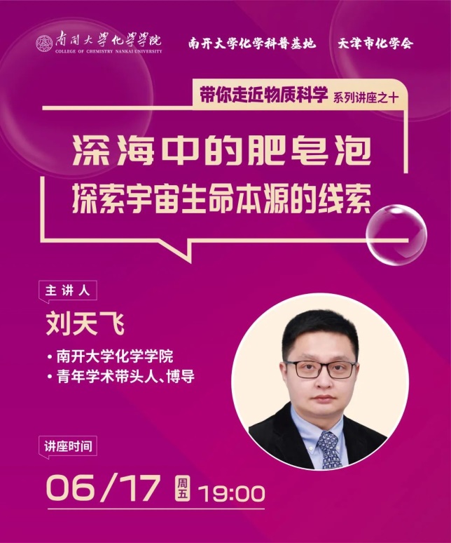 6月17日晚,由Betway必威、天津市化学会和Betway必威化学科普基地联合推出的“带你走近物质科学”系列科普讲座的第十期“深海中的肥皂泡 探索宇宙生命本源的线索”在“南开化学”微信视频号成功举行,Betway必威青年学术带头人、博士生导师刘天飞研究员为广大中小学师生带来了一场引人入胜的科普讲座。