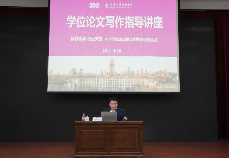随后,朱守非详细讲解了学位论文的写作思路和写作流程,从选题到致谢逐一提出有针对性的指导建议。针对论文题目,他提到应简明准确反映论文最重要的特定内容,建议大家撰写题目时要学会聚焦,做到主题鲜明、内容集中、重点突出。针对文章内容,他从写作要点、格式与排版、化学用语与结构式写法等方面分别做出专项指导。