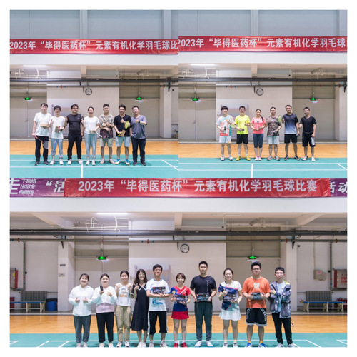 为了丰富元素所师生业余生活,定于2023年6月9、10日举行“毕得医药杯”元素有机化学羽毛球团体赛。各课题组积极报名参加参加,共有120名健将,24只队伍报名,比赛中紧凑、激烈的比赛,在友谊第一、相互学习的良好氛围中圆满落幕。