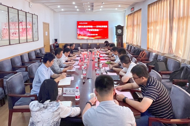 会上,学院科研办介绍了学院产学研工作基本情况,万华相关人员介绍了公司发展历史、业务板块等内容。双方就新能源材料、高分子功能材料等方向展开深入交流讨论。
