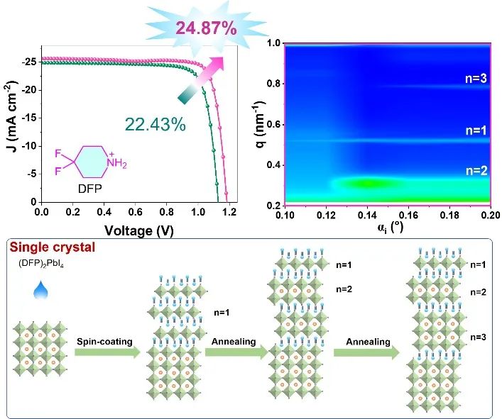 在过去的十几年里,钙钛矿太阳能电池得到快速发展,已经成为备受关注的新型光伏技术之一。然而,要实现其商业化应用,仍需进一步提升其效率和稳定性。通过构建2D/3D钙钛矿来结合2D钙钛矿的高稳定性和3D钙钛矿的高效率是提高钙钛矿效率和稳定性的主要方法之一。目前,常用的一种制备方法是在3D钙钛矿顶部涂布有机铵盐配体的溶液,以达到钝化表面缺陷的效果,并形成2D/3D钙钛矿异质结。这些有机配体与表面的3D钙钛矿或过量的碘化铅反应,形成具有不同n值的2D钙钛矿。然而,不同n值的2D钙钛矿的形成可能导致异质结处的能带排列不一致(I型或II型),从而对器件性能产生负面影响。此外,梯度有序分布的2D/3D异质结更有利于促进电荷的收集和传输。因此,迫切需要开发一种简单而实用的策略,以调节2D钙钛矿钝化层的相分布,更好地调控能级和整体器件性能。这将有助于克服目前面临的挑战,提高钙钛矿太阳能电池的稳定性,从而更好地满足未来光伏技术的需求。