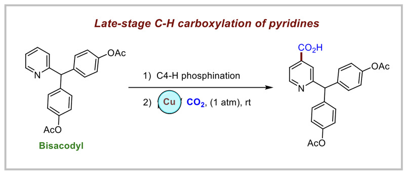 吡啶骨架广泛存在于药物活性分子、配体和功能材料中,尤其在药物化学领域,围绕吡啶骨架的官能化反应受到合成化学家的广泛关注。近年来,后期C-H键官能化反应的发展丰富了吡啶官能化的策略,然而,吡啶骨架的后期羧基化是一个长期存在的挑战,这也大大限制了新型吡啶羧酸类化合物的合成与开发。