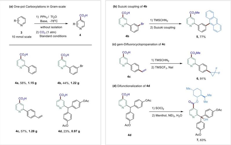 接着,作者直接从吡啶化合物出发,以克级规模一锅法高效得到了羧化产物。基于该体系优异的官能团耐受性,产物可以实现Suzuki偶联、二氟环丙烷化、酯化等衍生化转化,证明了基于该反应进一步拓展异烟酸类新化合物的可能。