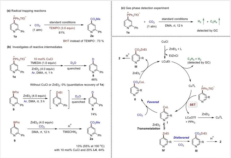 在反应机理方面,通过自由基捕获、活性中间体探索、气体检测等一系列机理实验,作者提出了由活性零价铜启动,经单电子转移得到一价吡啶铜物种,继而进行直接CO2插入的反应机理。反应中可能存在铜锌转金属化作用,生成吡啶锌试剂,但吡啶锌试剂在室温下只有很弱的羧化能力,因此,吡啶铜物种的生成是该反应室温下高效进行的关键。