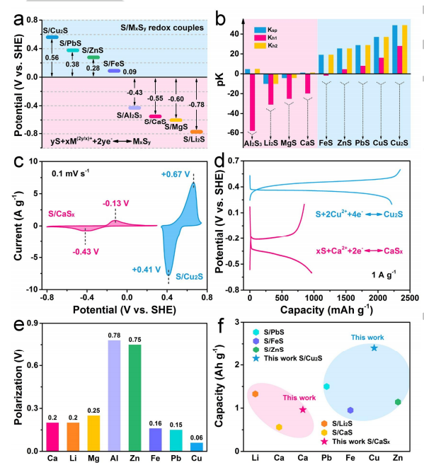 图2. a)S/MxSy氧化还原偶联的电极电位。b)金属硫化物的溶解度产物常数和水解常数。c) CV和d)含Cu2+或Ca2+电解质中硫电极的GCD曲线。e)极化程度和f)不同S/MxSy氧化还原对的比容量。