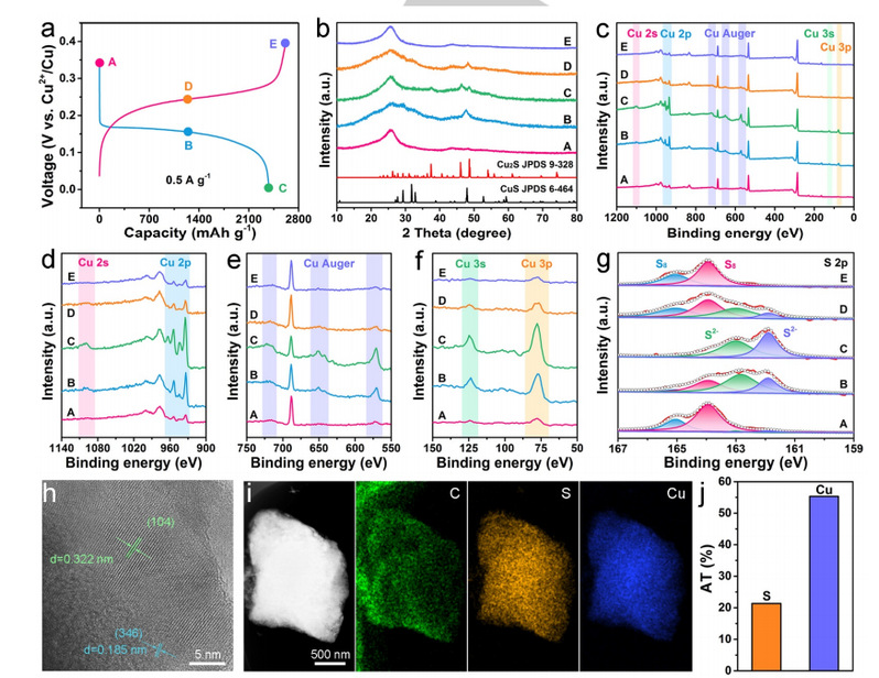 图3. 含Cu2+电解质中硫电极的储能机理。a)在0.5 A g-1时的第二个GCD曲线。b)c)全谱,d) Cu 3p和Cu 3s,e) Cu XPS,Cu3p,f)Cu3p和Cu 3s和g)不同充放电状态下的XRD模式和XPS谱。h)高分辨率TEM,i) TEM元素映射图像和j)完全放电电极的Cu/S原子比。