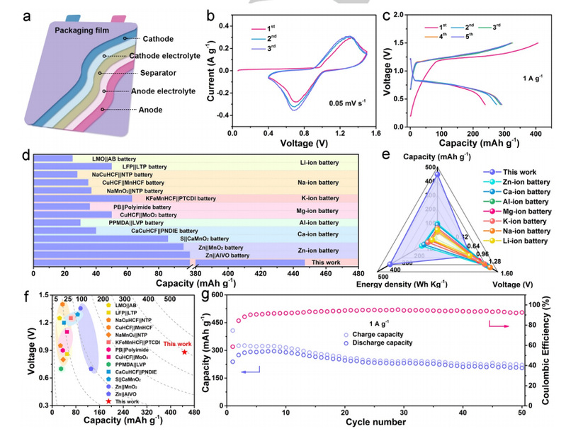 图5. a)软包全硫全电池示意图。b)在0.05 mV-1时的CV曲线,c)全硫全电池在1 A g-1时的GCD曲线。根据负极和正极活性物质的总质量,各种全水电池的比容量和电池的电化学性能的比较。g)在1 A g-1时的循环性能。