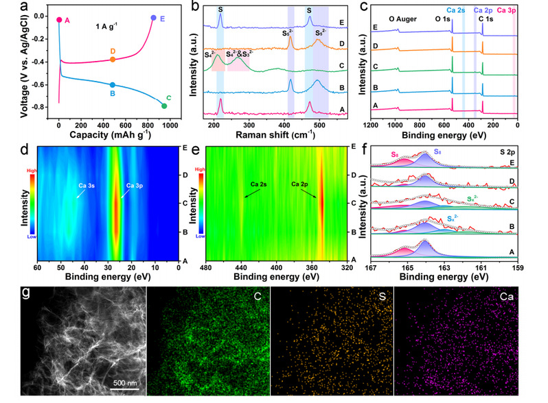 图4. 含Ca2+电解质中硫电极的储能机理。a)在1 A g-1时的第二个GCD曲线。b)c)全光谱,d) Ca 3p,e) Ca 2p和f) S 2p的拉曼光谱和XPS光谱。g)放电电极的TEM元素映射图像。