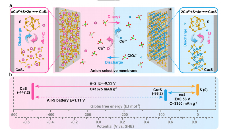 图1. a)充放电过程中的全硫水电池示意图。b)S、CaS和Cu2S的吉布斯自由能和反应电位。