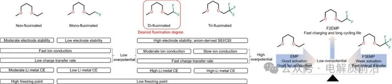理论计算和光谱揭示了从非氟化EMP到全氟化F3EMP的溶剂化能力逐渐降低,这导致离子电导率降低。相反,弱溶剂化氟化醚具有更高的Li+迁移数和交换电流密度。总体而言,部分氟化−CHF2被证明是所需的基团。