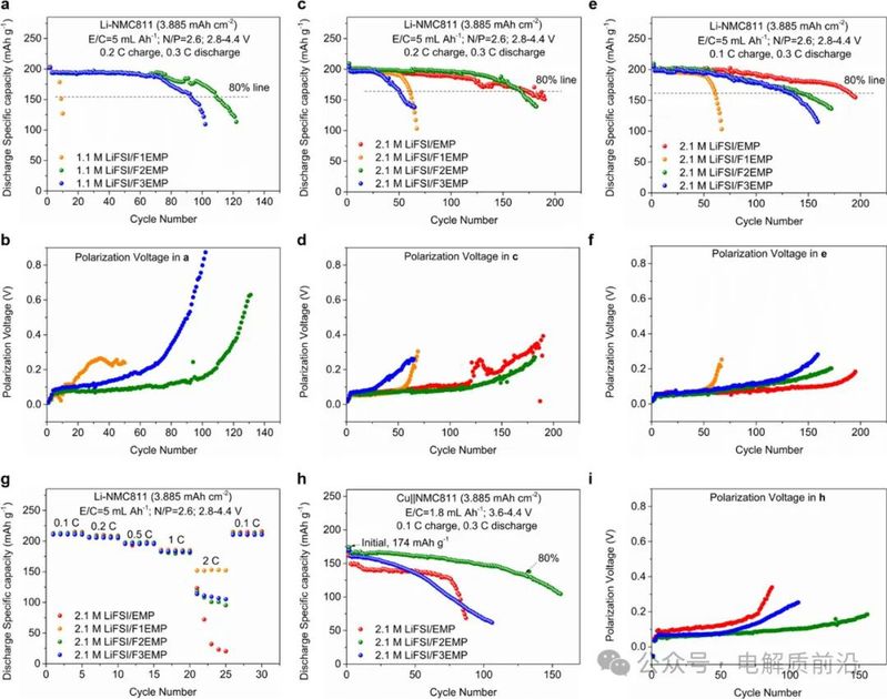 使用高压(4.4 V)和高负载(3.885 mAh cm–2)LiNi0.8Co0.1Mn0.1O2阴极进行的进一步全电池测试表明,在有限的Li(50μm)和贫电解质(5 mL Ah−1)条件下进行168次循环,在极贫电解质(1.8 mL Ah–1)和无阳极条件下进行129次循环后,F2EMP电解质能够保持80%的容量。