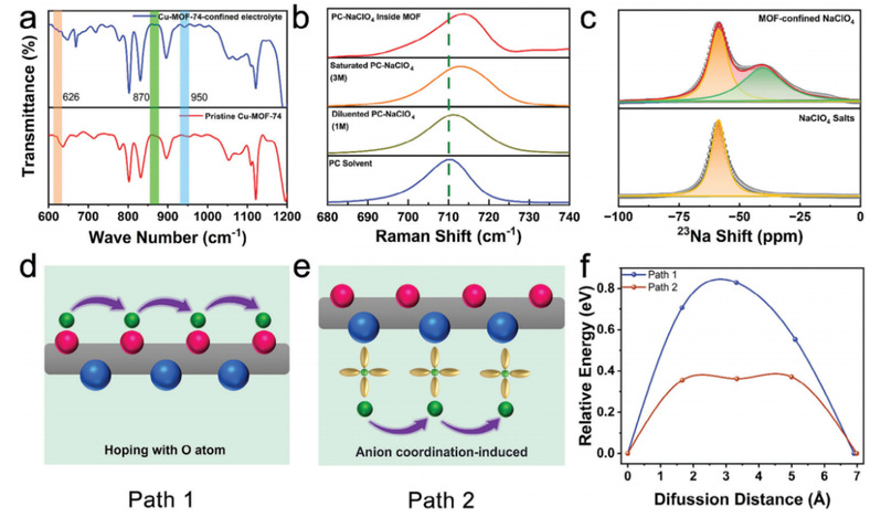 图 3. a) 原始 Cu-MOF-74 粉末和 MOF 封闭电解质的傅立叶变换红外图谱。b) PC 溶剂、稀释 PC-NaClO4 (1m)、饱和 PC-NaClO4 (3m) 和 MOF 封闭电解质的拉曼图谱。两种可能的 Na+ 迁移路径:d) 与 O 位点跳跃,e) 阴离子强化迁移(颜色代码:Cu,蓝色;Na,绿色;O,红色;Cl,黄色)。