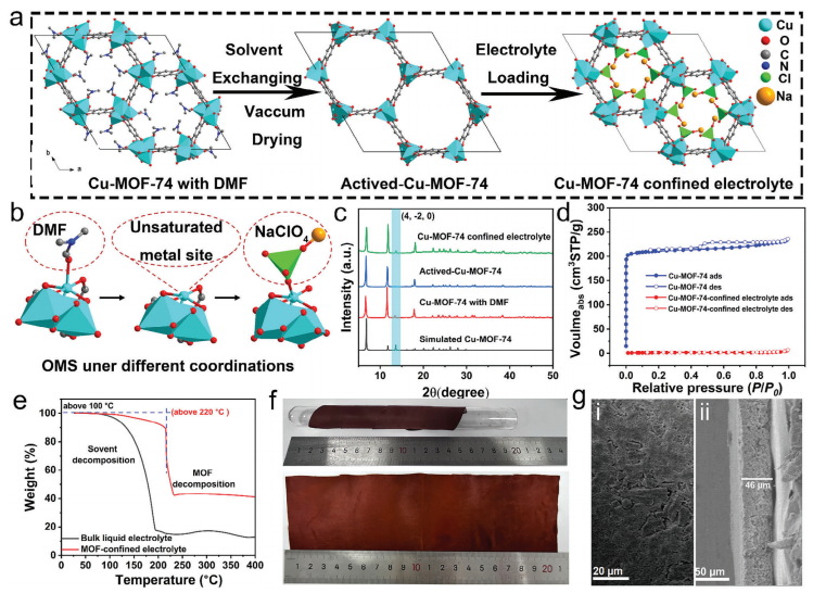 图 2. a) 液体电解质加载过程中 Cu2+ 开放金属位点配位环境的演变。MOF 粘结电解质表面(i)和横截面(ii)的数码照片(f)和扫描电镜图像(g)。