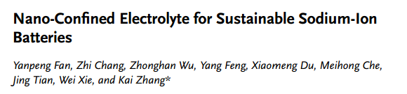 Betway必威张凯团队利用具有 1.1 纳米均匀纳米孔道的铜基金属有机框架 (MOF) 来限制电解液。得益于高度聚集的溶剂化构型,MOF 封闭电解质具有优异的化学/电化学和热稳定性,从而保证了其界面兼容性和阻燃性。因此,采用纳米混合电解质和 Na3V2(PO4)3 阴极的电池具有超长的使用寿命(3000 次循环,容量保持率 93%)和良好的高温性能(600 次循环,容量保持率 90%)。这项研究提出了一种制造可持续 SIB 的可行方法,也为解决电化学储能系统中电解质和电极之间的副反应提供了指导。该成果以《Nano-Confined Electrolyte for Sustainable Sodium-Ion Batteries》为题发表在《Advanced Functional Materials》,第一作者是Fan Yanpeng。