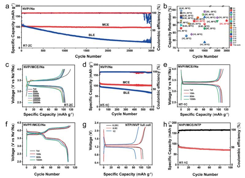 图 5. a) NVP//MCE//Na 和 NVP//BLE//Na 电池的长期循环性能(室温下 2 C)。b) 已发表论文中使用非流体电解质的 NVP//Na 电池的容量保持率。c) NVP//MCE//Na 电池在 2 C条件下的放电-充电曲线。d) MCE 和 BLE 与 NVP//Na 电池在 1 C下的高温(60 ℃)循环稳定性及其放电/充电曲线(e)。f) 与 NVPF 高压阴极耦合的 MCE 的选定放电-放电曲线。g) NTP//NVP 全电池在不同电流速率下的充放电曲线。