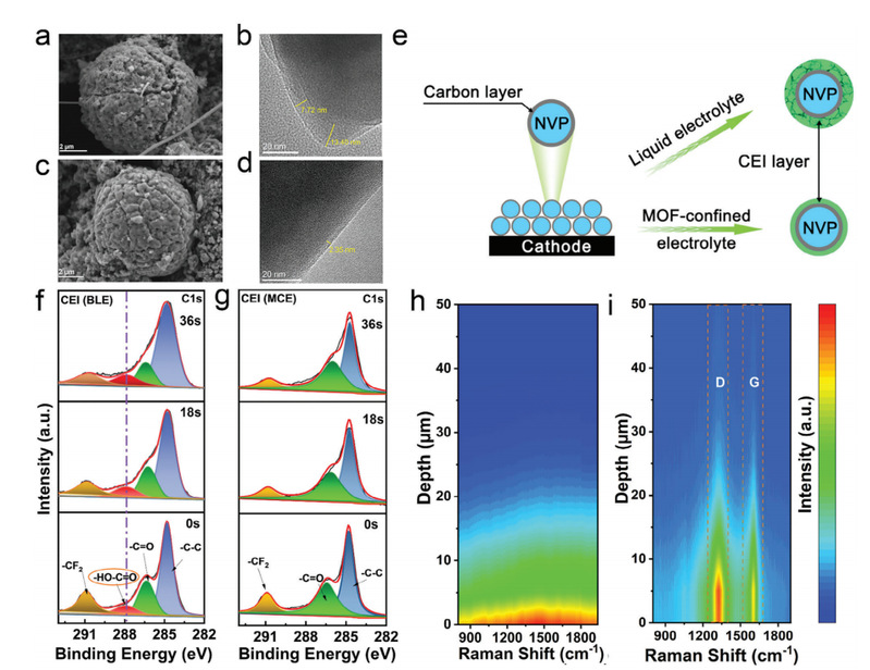 图 6.使用 BLE 和 MCE 循环 NVP 阴极的特性。从使用 BLE(a,b)和 MCE(c,d)的 NVP/Na 半电池中提取的循环 NVP 阴极(200 个循环后)的 SEM 和 TEM 图像。使用 BLE 和 MCE 的电池的 CEI 形成机制示意图(e)。不同深度下 BLE 阴极(h)和 MCE 阴极(i)的氩刻蚀 XPS C 1s (f,g)和拉曼图谱。