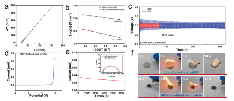 图 4. a) 对称纽扣电池(SS//MCE//SS)在室温下的离子电导率和相应阻抗。b) MCE 和 BLE 的相应活化能。d) MCE 的线性扫描伏安曲线(LSV)。e) MCE 的极化曲线和电化学阻抗谱(插图)。f) 制备的 MCE 和渗入玻璃纤维中的 LE 的可燃性测试照片。