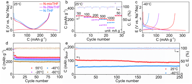图5.(a)HC在N-mixTHF、N-2MeTHF和N-THF中在25°C下的首次充放电曲线,电流密度为50 mA g-1以及(b)倍率性能。(c)HC在-40°C下的首次充放电曲线,电流密度为50 mA g-1,以及(d)HC在不同温度下(-20°C以上时电流密度为100 mA g-1,-40°C和60°C时电流密度为50 mA g-1)在N-mixTHF中的长循环性能。(e)25°C(200 mA g-1)和-40°C(50 mA g-1)时全电池的循环性能。
