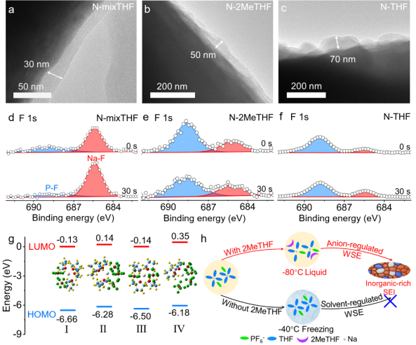 图3. HC负极在(a)N-mixTHF、(b)N-2MeTHF和(c)N-THF中在-40°C下经过三个循环后的高分辨透射电镜(HRTEM)图像,以及(d-f)对应的F 1s的XPS光谱。(g)不同溶剂化结构的HOMO和LUMO能级:(Ⅰ)Na+[PF6-]2[THF]4、(Ⅱ)Na+[PF6-]3[2MeTHF]3、(Ⅲ)Na+[PF6-]4[2MeTHF][THF]3和(Ⅳ)Na+[PF6-]4[2MeTHF]2。(h) Na+-偶极调控对富无机SEI形成机制的影响示意图。