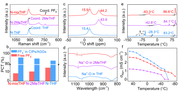 图1.(a)N-mixTHF、N-2MeTHF和N-THF的拉曼光谱;(b)不同配位结构的比例;(c)17O NMR光谱;(d)FTIR光谱;(e)DSC曲线;(f)电导率。Ts:盐析温度。