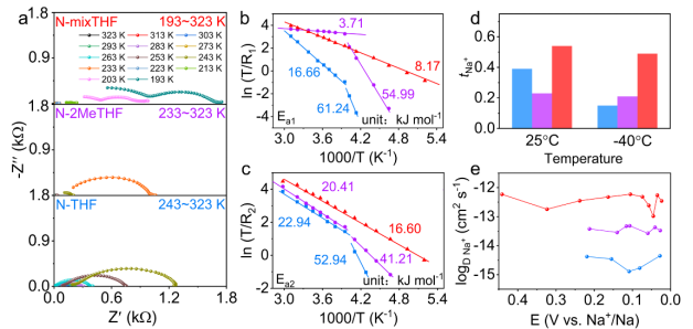 图4.(a)Na||Na对称电池在N-mixTHF(193至323 K)、N-2MeTHF(233至323 K)和N-THF(243至323 K)中经过五十次沉积和剥离后的Nyquist图。(b)从Nyquist图中计算出的Na+通过SEI的传输活化能Ea1和(c)Na+去溶剂化能Ea2。(d)在25°C和-40°C下,三种电解液中的tNa+。(e)在-40°C下,HC负极在三种电解液中的GITT曲线。