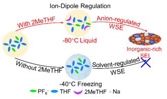 钠离子电池(SIBs)由于钠资源丰富、成本低等优势被认为是大规模储能的潜在候选者。然而,SIBs的宽温域运行受到低温下电解液和不稳定负极的适应性限制。这与Na+脱溶动力学和离子在固体电解质界面(SEI)中的传输密切相关。尽管碳酸酯基电解液已广泛应用于SIBs,但溶剂中羰基与Na+之间显示出强的Na+-偶极相互作用,导致溶剂鞘中溶剂配位增多。这将使得碳酸酯基电解液凝固点升高,进而引起低温下负极倍率性能不佳等问题。醚类电解液因具有比碳酸酯更低的粘度和更好的还原稳定性而受到广泛关注。然而,强烈的Na+-溶剂配位也会导致低温下缓慢的Na+脱溶剂动力学以及富有机组分SEI的形成。不稳定的SEI阻碍了界面离子传输,并持续诱导电解液分解,导致低温下差的循环稳定性。因此,对离子-偶极相互作用和溶剂结构进行适当调节,以改善低温下高性能SIBs的界面动力学,对于提高SIBs的低温电化学性能至关重要。