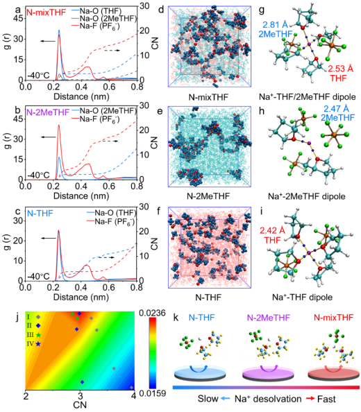 图2.(a-c)从分子动力学模拟中得到的电解液在-40°C下的Na+溶剂化构型的径向分布函数(RDF)。(d-f)-40°C下三种电解液的分子动力学模拟快照。浅珊瑚色、青绿色、深蓝色和红色分子分别代表配位的THF、2MeTHF、PF6-和Na+。(g-i)不同电解液的典型溶剂化结构,温度为-40°C。键路径上的蓝色点代表BCP点。(j)三种电解液中Na+-O键的BCP电子密度。(I)N-THF中的O、(Ⅱ)N-mixTHF中的THF的O、(Ⅲ)N-2MeTHF中的O和(Ⅳ)N-mixTHF中的2MeTHF的O。(k)不同电解液在HC负极表面的Na+脱溶剂化示意图。
