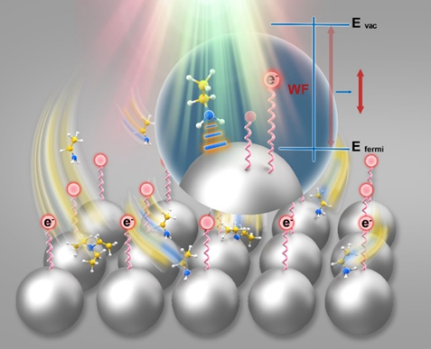 此外,作者根据SERS与DFT计算揭示了胺引起等离激元热电子能量提高的原因。结果表明,在光照下,反应体系中的胺分子可以通过形成Ag-N键化学吸附在Ag表面,这一成键降低了金属纳米颗粒的功函数,从而引起通过LSPR产生的热电子能量的重新分配。
