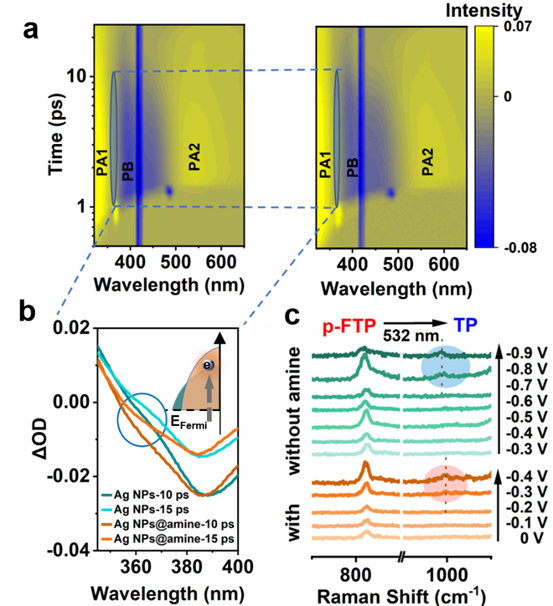 图1 (a) Ag NPs在有(右)和没有乙胺(左)条件下的瞬态吸收光谱。(b) 有(橙色)和无乙胺(绿色)条件Ag NPs的瞬态吸收光谱比较。插图显示了乙胺作用下非平衡热电子能量分布的变化。(c)有无乙胺作用下C-F键断裂原位SERS光谱。