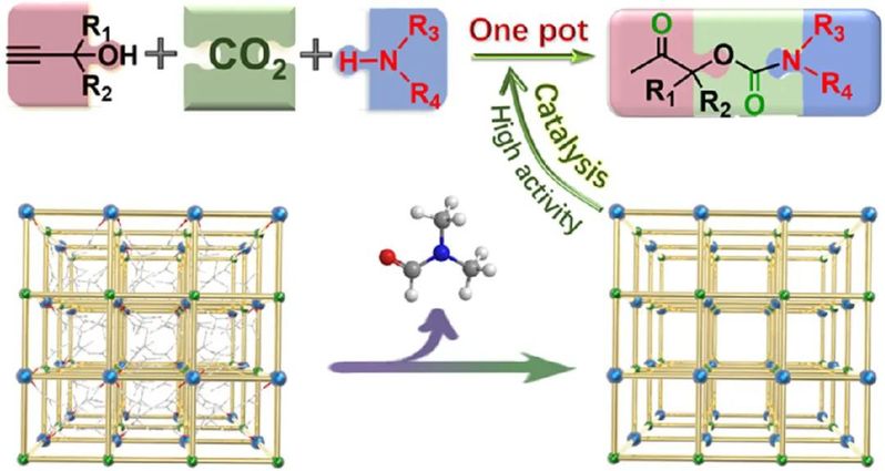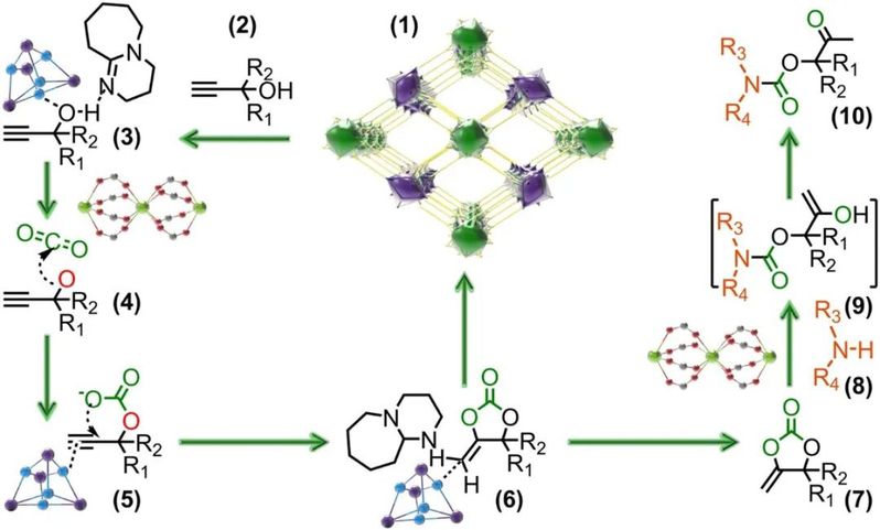 将CO2作为廉价的C1资源,既可以取代光气和一氧化碳等有毒气体制备高附加值产物,又可以缓解环境气候问题,具有一石二鸟的作用。然而由于CO2独特的离域电子结构,其在催化转化过程中具有较高的化学稳定性和动力学惰性,常需要用到高温高压等苛刻条件和贵金属催化剂。因此,虽然有很多关于CO2转化的杰出工作被报道,但主要集中在双组分反应。CO2参与的三组分反应由于存在反应路径复杂和产物选择性差等问题,对催化剂的要求也随之提高,还亟需更多研究。例如,β-羰基氨基甲酸酯类化合物作为重要的有机中间体,在医药、农药、织物整理和树脂改性等领域具有广阔的应用前景。催化炔醇类底物、仲胺类底物和CO2一锅法高选择性地生成β-羰基氨基甲酸酯类产物可以有效的降低工业生产成本、减少垃圾生成和简化操作工艺等。基于此,我们在前期CO2转化研究工作的基础上,拟构建具有多催化位点的簇基多孔材料来实现β-羰基氨基甲酸酯类化合物的三组分合成,原因如下:1) 簇基多孔材料中的孔结构可以富集底物,促进底物与活性中心充分接触。同时其催化位点高度分散在框架内,可以提升催化剂的利用率。2) 低价态的金属离子在催化炔醇类底物的反应中具有较高的活性,高价态金属离子能促进C-C和C-N成键和开环反应。配位多孔材料良好的可设计性使得可以将不同的金属位点结合在一个框架内,进而产生协同效应,实现β-羰基氨基甲酸酯类化合物的高效合成。