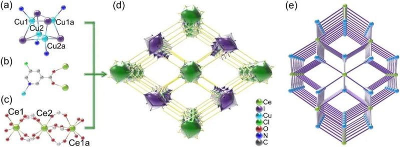 研究者们首先合成了一种新颖的簇基配位多孔材料 CuCe-CNA(CNA=5-氯烟酸),其具有[Cu4I4]簇和[Ce3]簇两种金属节点,并表现了良好的化学稳定性和热稳定性(图1)。