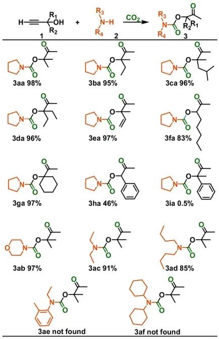 表1. CO2、炔醇与仲胺类化合物的三元催化反应
