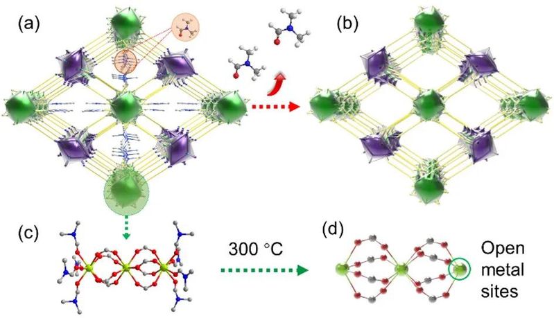 进一步研究发现,通过移除[Ce3]簇节点上配位的DMF分子,可以产生配位不饱和位点,从而暴露出金属活性中心,有利于后续的催化反应(图2)。为了去除框架中配位的DMF分子,选择300 ºC作为活化温度,得到CuCe-CNA-300。PXRD、TGA、FT-IR、SEM、TEM、固体13C NMR以及XPS数据均表明CuCe-CNA-300可以保持多孔框架结构的稳定。