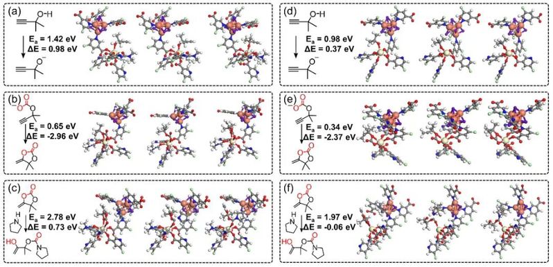 通过系列对照反应系统地研究了[Cu4I4]和[Ce3]节点在该三元催化反应中的作用,结果表明,CuCe-CNA-300中[Cu4I4]簇是反应体系中的主要催化活性位点,且[Cu4I4]簇和[Ce3]簇之间存在协同催化作用。并通过理论计算及一系列不同稀土元素和[Cu4I4]簇构筑的同构的多孔材料 CNA-Ln-300的催化性能的对照,进一步证明了[Cu4I4]簇和[Ce3]簇之间的协同催化作用。