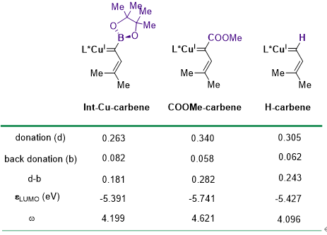 最后,他们通过计算分析比较了Bpin取代、COOMe取代以及H取代三类卡宾的性质(图6)。电荷分解分析(CDA)表明,Bpin取代卡宾中的卡宾残基对金属铜中心转移的电荷密度(0.181)最小,而且其LUMO能量(-5.391)相较于其它两类卡宾也更高,这表明α-硼基卡宾可能是亲电性较弱的一类卡宾。Bpin取代卡宾的LUMO能量以及亲电指数与H取代卡宾的类似,这表明这两类卡宾在电子性质上较为相似,因而α-烯基-α-硼基卡宾应该是一类给体型卡宾。