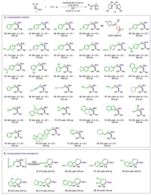 图3. 铜催化α-硼基卡宾的不对称环丙烷化以及环丙烷化/Cope重排反应
