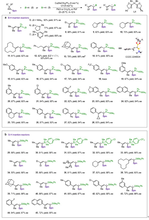 图2. 铜催化α-硼基的不对称B-H/Si-H键插入反应