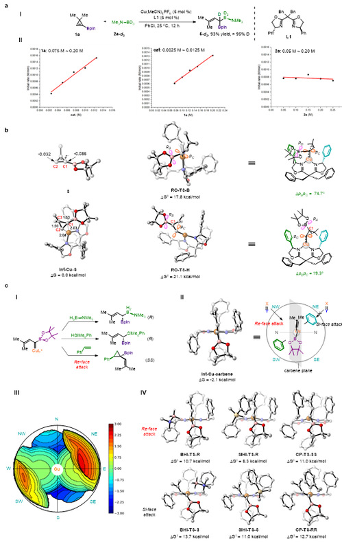 在B-H键插入反应的氘代实验中,硼和氘加成到同一个碳上,说明反应可能经历了卡宾插入的过程(图5a, I)。原位红外测定的B-H键插入反应的动力学级数表明反应对环丙烯底物1a、铜催化剂为一级,对硼烷加合物为零级(图5a, II),说明环丙烯开环可能是反应的决速步,这与DFT计算结果相符合。对1-硼基环丙烯1a中C1和C2的Hirshfeld电荷分布计算结果表明,硼基的空p轨道对烯键有明显的极化作用,使得与其相连的C1具有更多负电荷,更容易被缺电子的Cu催化剂进攻(图5b)。而在底物与催化剂形成的配位中间体Int-Cu-S中,Cu-C1的键长比Cu-C2的键长稍短,而C1-C3键较C2-C3键更长,表明Cu中心确实更倾向于进攻C1端从而活化C1-C3键。另一方面,对两种开环方式的过渡态分析表明,在硼端开环的过渡态RO-TS-B的能量确实比氢端开环过渡态RO-TS-H的能量要低,这可能是由于,在RO-TS-B中硼基的空p轨道与卡宾碳的缺电子p轨道近乎垂直(76.4o),避免了共轭,由于硼的电负性比碳低,因而主要表现出σ-给电子效应,有利于稳定过渡态;而在RO-TS-H中,硼基的空p轨道与卡宾碳缺电子p轨道处于近乎平行的状态(19.3o),两者可通过C1-C2的烯键共轭,稳定性较差,因而能量更高。此外,通过对三种产物绝对构型的分析,他们发现卡宾捕获试剂(硼烷、硅烷、烯烃)都是从卡宾的Re面进攻的,这表明三类反应可能有共通的手性模型(图5c, I)。通过对铜卡宾位阻图的分析,可以发现卡宾的东北(NE)与西南(SW)部分被手性双噁唑啉配体的两个芳基所屏蔽,而环丙烯形成的卡宾部分就坐落在由西北(NW)到东南(SE)的沟壑之中。由于硼基的空2p轨道要尽量避免与卡宾碳的p轨道共轭,因此Bpin基团采取与卡宾平面相垂直的取向,屏蔽了整个南部区域。因此,卡宾捕获试剂从位阻最小的西北处进攻能量最低(图5c, IV),得到了Re面进攻的产物(图5c, II, III)。综合来看,硼基有两个作用,一方面极化了烯基,诱导了环丙烯开环的化学选择性;另一方面,硼基与卡宾平面近乎垂直的构象增大了卡宾的位阻和刚性,使催化剂的手性空腔能够有效识别反应的手性面,实现了不同卡宾转移反应的手性控制。
