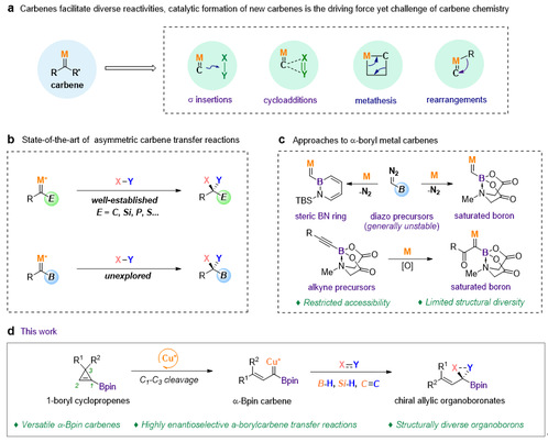 卡宾是有机化学中重要的中间体,具有丰富的反应性,涉及卡宾的有机反应在药物化学、农药化学以及材料化学中广泛应用。可用于催化反应,特别是不对称催化反应的新型卡宾的发现是卡宾化学发展的核心推动力,不仅会丰富卡宾转移产物的类型,还为新型卡宾转移反应的发现奠定基础。过去的几十年中,过渡金属催化主族元素(如碳、硅、磷、硫等)取代卡宾的不对称转移反应已经被广泛用于多种碳-碳或碳-杂原子键的构筑。与这些元素的官能团相比,硼酸或硼酸酯基团由于其Lewis酸性、与醇或胺等亲核试剂可逆结合的倾向以及形成氢键的能力而展示出独特的化学以及生物特性,在合成化学、材料科学、化学传感以及药物发现中被广泛应用。可以预见,结合了卡宾与硼基团的α-硼基卡宾在有机硼合成中将有着独特的应用潜力。然而α-硼基卡宾的研究却非常有限,这主要是由于α-硼基的强Lewis酸性使得一般重氮前体难以稳定存在,目前仅有基于大位阻α-硼氮杂环重氮或α-四配位硼基磺酰腙取代的两类硼基卡宾被用于过渡金属催化的转移反应。整体而言,目前α-硼基卡宾的生成方式非常有限,结构类型单一,且其催化不对称转移反应还未见报道,极大地限制了其应用潜力。