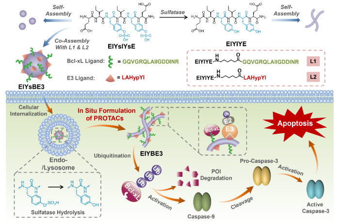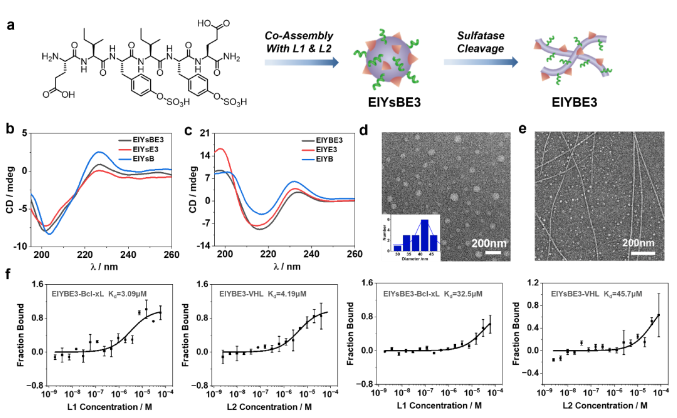 在前期构建刺激响应型多肽可控组装策略及生物医用功能材料的工作基础之上,余志林团队设计了一个核心序列中包含两个硫酸化酪氨酸残基的六肽(EIYsIYsE),同时合成了天然对应肽(EIYIYE),构筑了基于硫酸酯酶响应的多肽可控组装体系。此外,配体L1和L2分别能够与抗凋亡蛋白Bcl-xL和E3泛素连接酶VHL结合,在L1和L2对Bcl-xL和VHL的蛋白亲和力的指导下,将EIYsIYsE与L1和L2以适当的摩尔比共组装构筑超分子PROTAC EIYsBE3。在过表达硫酸酯酶的癌细胞中,超分子PROTAC EIYsBE3精确地经过酶响应组装成纳米纤维超分子PROTAC EIYBE3。EIYBE3特异性降解Bcl-xL蛋白,激活Caspase依赖的凋亡通路,从而达到肿瘤治疗的效果。因此,活细胞中多肽的原位自组装为选择性地在靶向位点上原位制备PROTACs提供了一种潜在的策略。溶液中的共组装实验表明酶催化的硫酸化共组件组装成明确的纳米原纤维,从而允许在硫酸酯酶催化水解后从前体制备超分子PROTAC,蛋白结合亲和力研究结果表明了肽纳米原纤维的形成在配体-蛋白相互作用和PROTAC功能中的关键作用。
