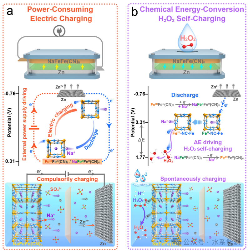 Zn/NaFeFe(CN)6电池在(a)充电过程和(b)H2O2自充电过程中的工作机理示意图。