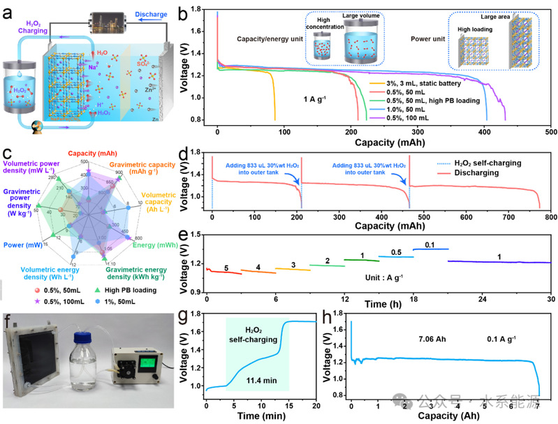 a)工作原理示意图。b)3 mL 3 wt% H2O2的静态电池和不同H2O2含量的单流电池的放电曲线。c)不同H2O2含量的单液流电池的容量、能量和功率比较。d)50 mL 0.5 wt% H2O2在1 A g-1下的自充放电循环性能。e)在不同电流密度下的速率能力。f)光学照片,(g)自充电过程的电压-时间曲线,(h)实验规模单液流电池放电曲线。