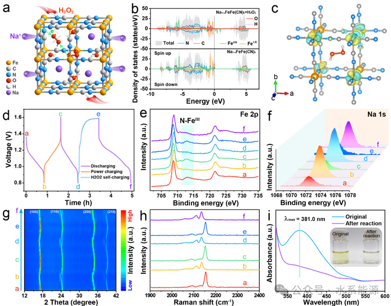 a)氧化还原反应机理示意图。b)Na1+xFeFe(CN)6在有或没有H2O2作用下的态密度。灰色虚线表示费米能级的位置。c)Na1+xFeFe(CN)6与H2O2的差分电荷密度分析。黄色和青色区域分别代表电荷积累和消耗。d)0.1 A g-1下的放电/充电曲线。(e)Fe 2p和(f)Na 1s对应的XPS谱图,(g)XRD谱图,(h)不同状态下的拉曼光谱。i)不同状态下H2O2-Ti(IV)络合物溶液的紫外-可见光谱(插图为H2O2-Ti(IV)络合物溶液的数码照片)。