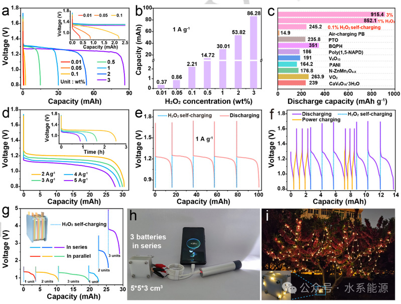 a)不同H2O2浓度下H2O2自充电电池在1 A g-1下的放电曲线。b)放电容量与H2O2浓度的相关性。c)H2O2自充电电池与其他先前报道的化学自充电系统的放电容量比较。d)1 wt% H2O2自充电电池在不同电流密度下的放电曲线(附图为相应的电压-时间曲线)。e)间歇向电池中加入0.5 wt% H2O2的自充放电性能。f)双充电模式下的充电/放电行为。g)电池组并联和串联时的H2O2自充放电性能。由三节单体电池串联供电的(h)手机和手电筒、(i)LED阵列。